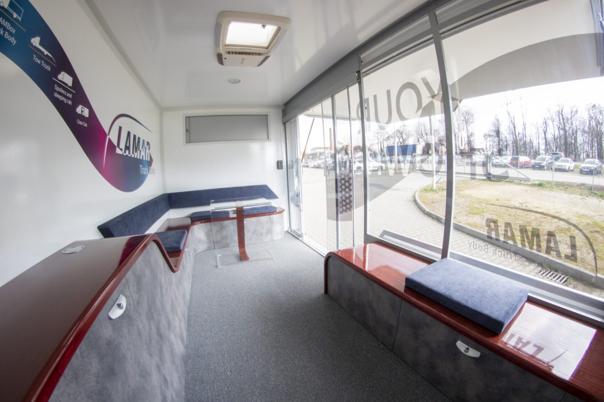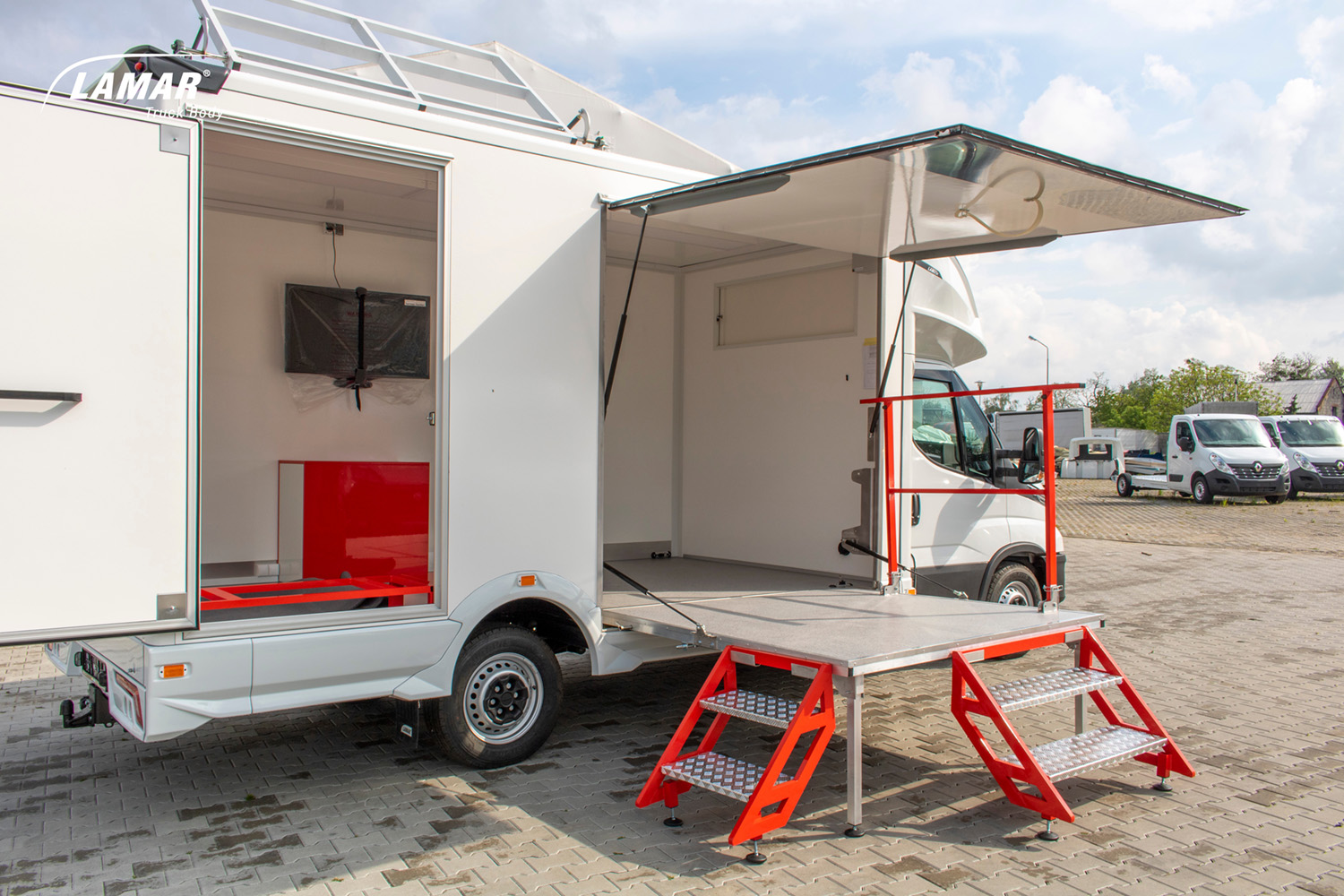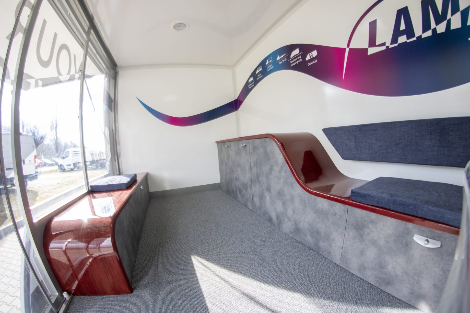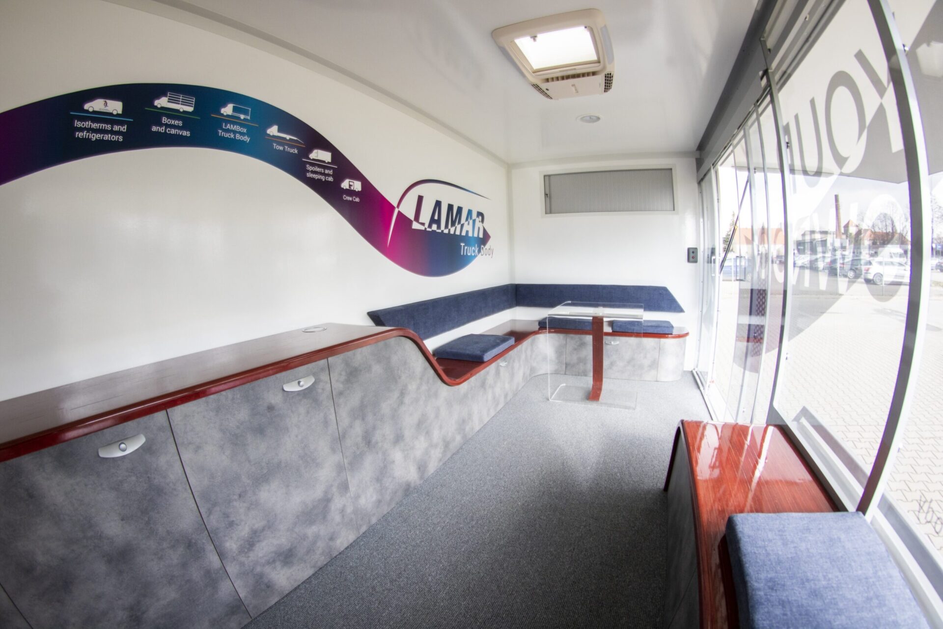 Nasze pojazdy są projektowane stricte pod Klienta. W zależności od prowadzonej działalności, oferujemy całą paletę rozwiązań takich jak: klapy boczne, podesty, ściany w poliwęglanu, lady, wysuwane i składane reklamy dachowe, drzwi i okna w różnych lokalizacjach i rozmiarach, sekcje wodne (zlewy, umywalki, WC), TV, głośniki czy megafony. Wykonujemy meble na zamówienie, stoły, kanapy, fotele, biurka, szafy… Wszystko czego potrzebujesz by wypromować swoje produkty. LAMBOXy wykorzystywane są w całej europie jako centra szkoleniowe.