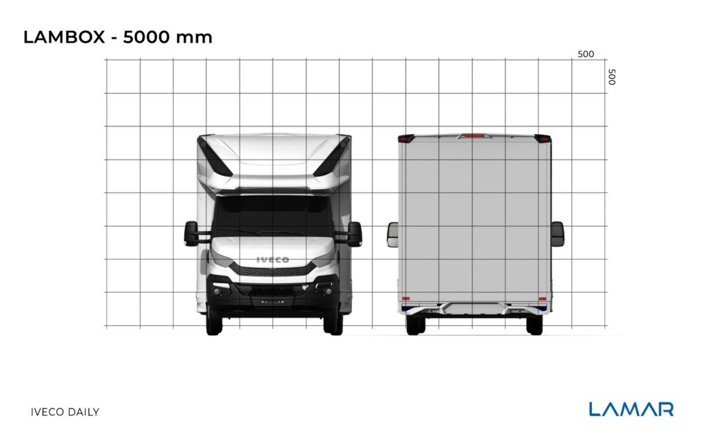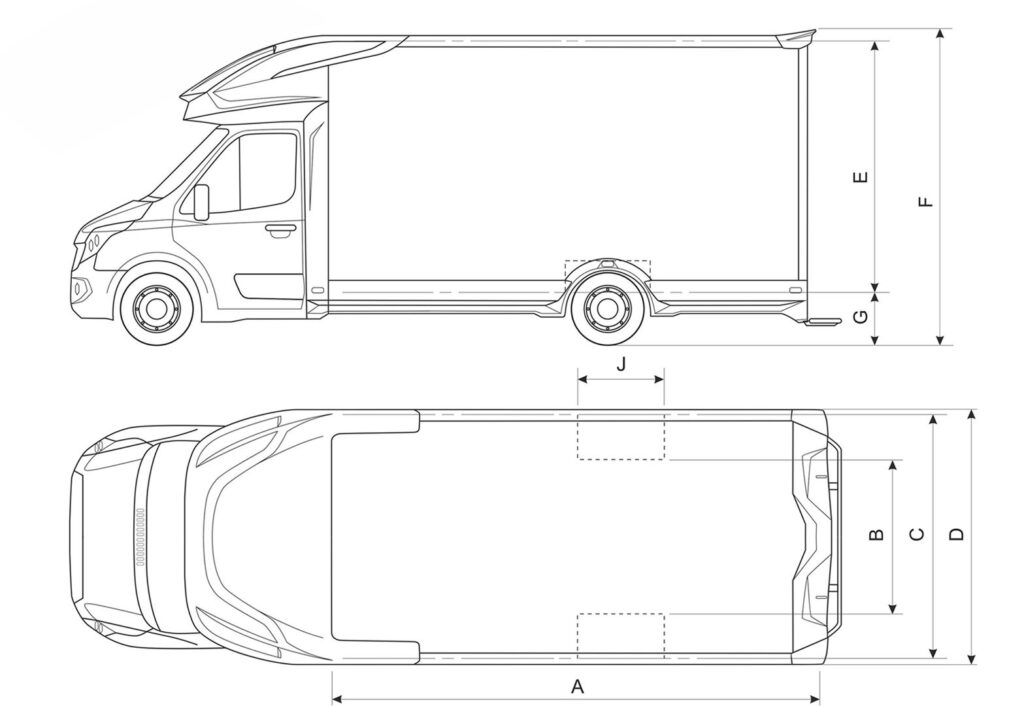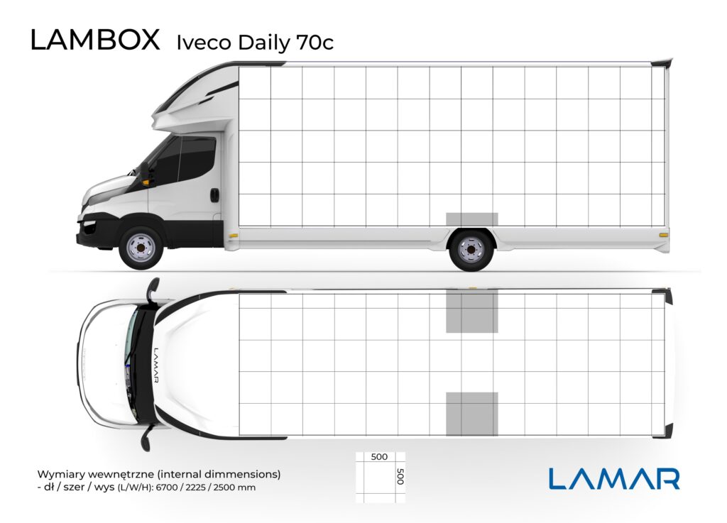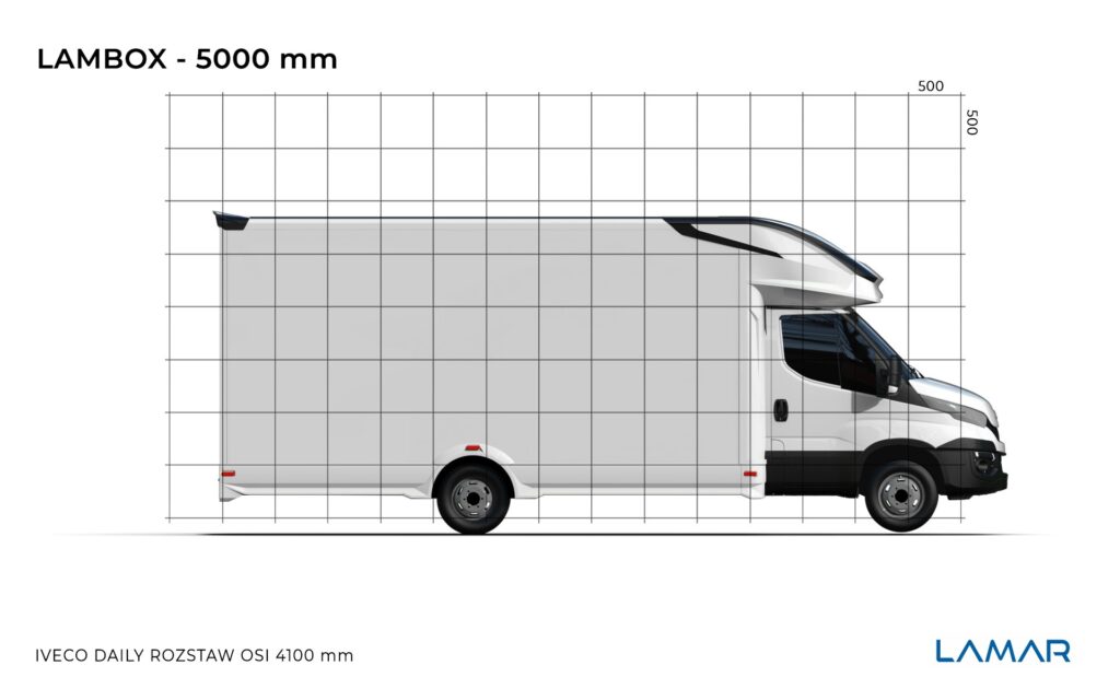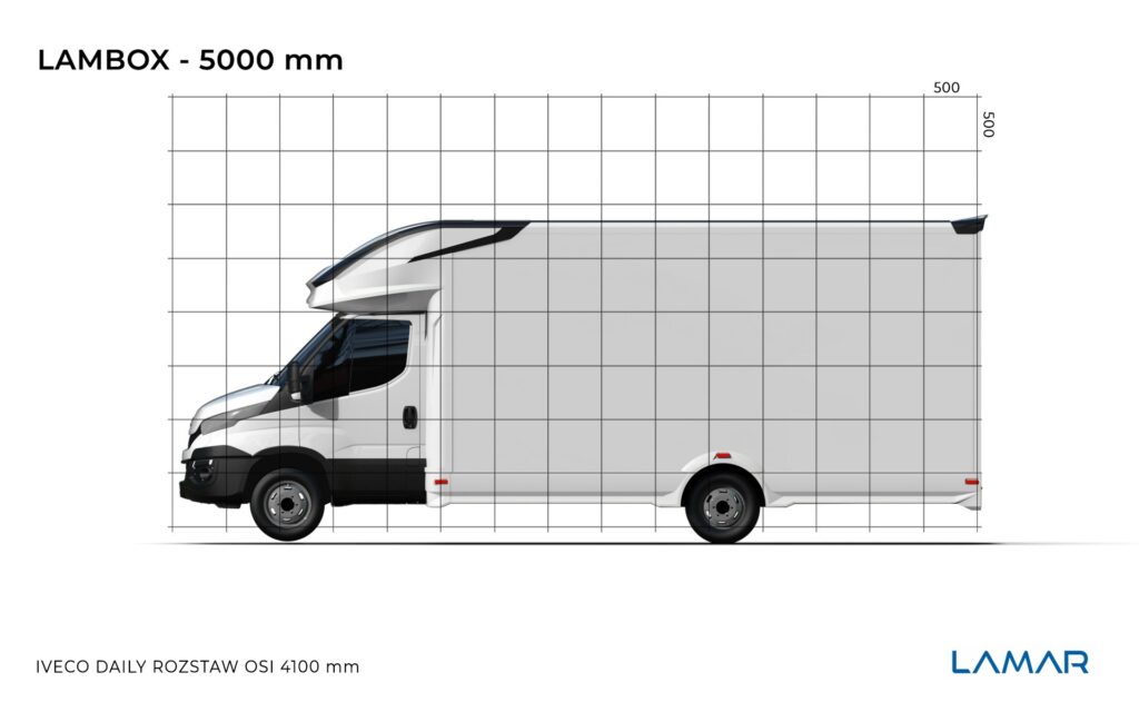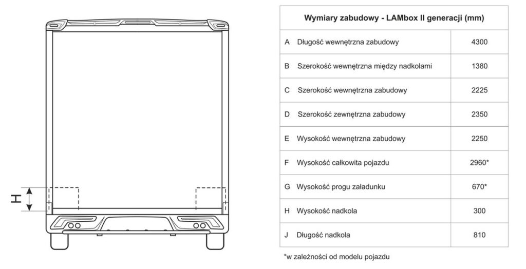 Standardowy LAMBOX o DMC 3.5 t zaczyna się od wymiarów wewnętrznych: 2225x2250x4300 mm (szer, wys dł). Jeśli chodzi o wysokość to oferujemy także 2500 mm wysokości w środku i podwyższoną alkowę nad kabiną. Ponieważ LAMBOX jest oferowany na wszystkich podwoziach czołowych producentów, to jeśli chodzi o długości mamy dużo większe zakresy regulacji (w zależności od rozstawu osi oraz wytycznych producenta podwozia).